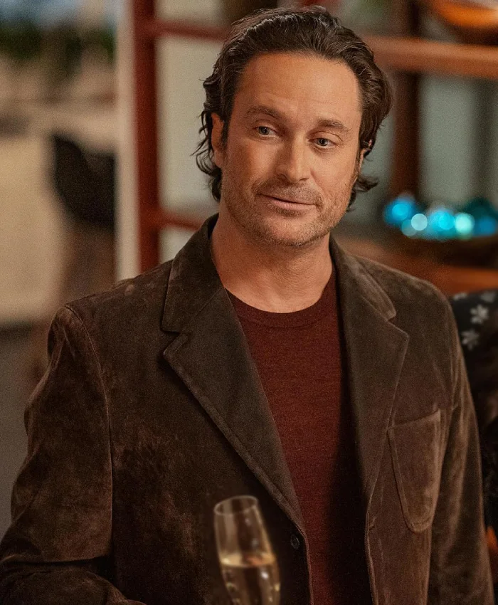 Oliver Hudson stars as Everett, one of the leads in the upcoming 2025 Christmas movie A Merry Little Ex-Mas, filmed in Toronto, Ontario, Canada. As the movie revolves around Christmas, which occurs in the winter, we can see characters in the movie’s official trailer wearing winter-friendly outfits, such as A Merry Little Ex-Mas Oliver Hudson Brown Blazer. Similar to various other outfits, the brown blazer, as mentioned earlier, is creating lots of buzz among movie fans and fashion lovers alike. So, we have created a very similar blazer for you at Leather Jacket Black (LJB) from velvet, available for purchase here as a unisex clothing item.