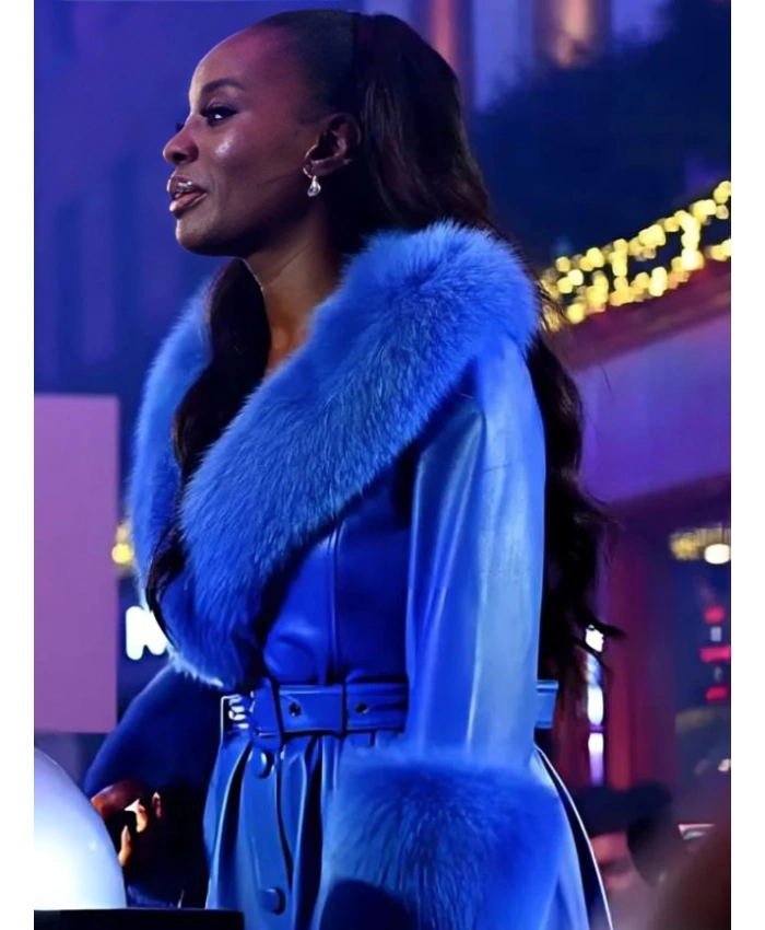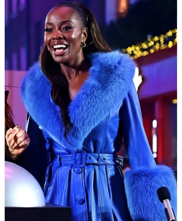 Carnaby Christmas Lights Switch-On 2025 AJ Odudu Belted Fur Trim Blue Leather Coat