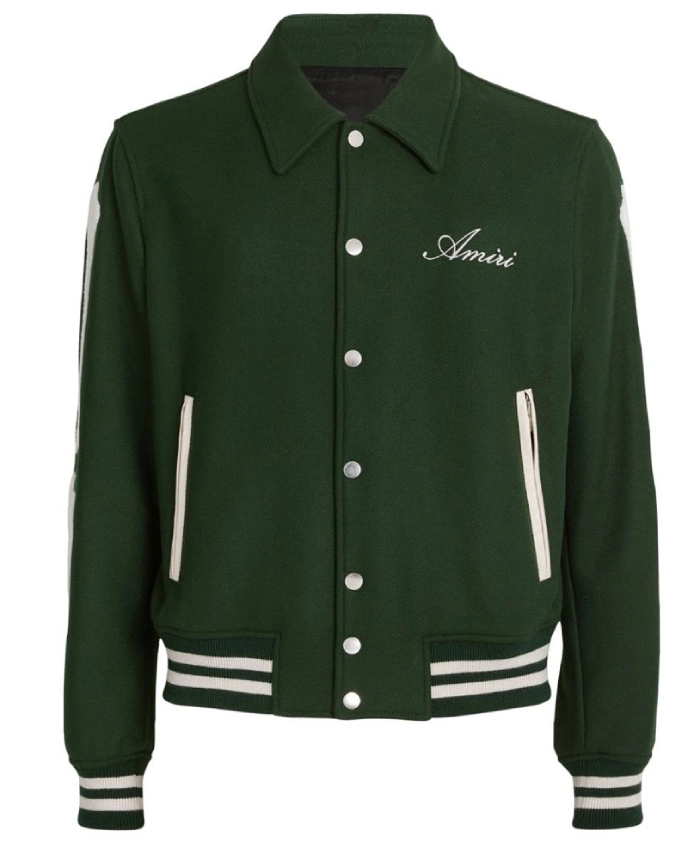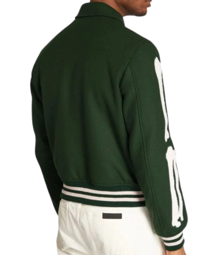 Moreover, it is also crafted from premium wool fabric with a soft viscose lining. Well, offers lasting comfort and warmth. The snap tab buttoned closure gives it a sleek, structured fit. At the same time, the long sleeves and shirt-styled collar add a touch of timeless refinement. Its striking green color makes it pop with freshness. At the same time, the ribbed hemline and rib knitted cuffs enhance. Both comfort and durability for all-day wear. Designed for fashion-forward individuals. The Men and Women Amiri Bones Letterman Wool Varsity Jacket.