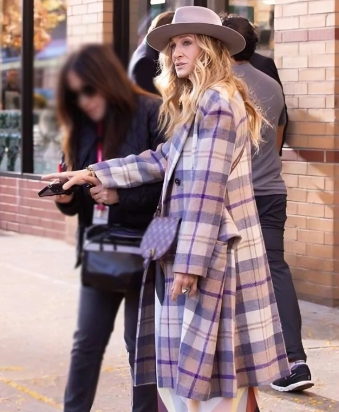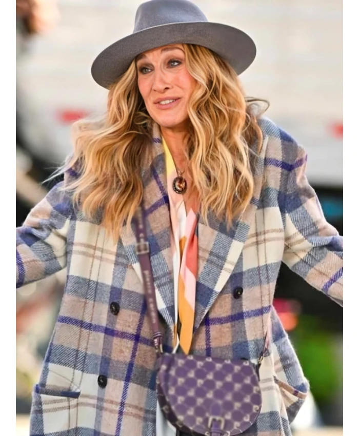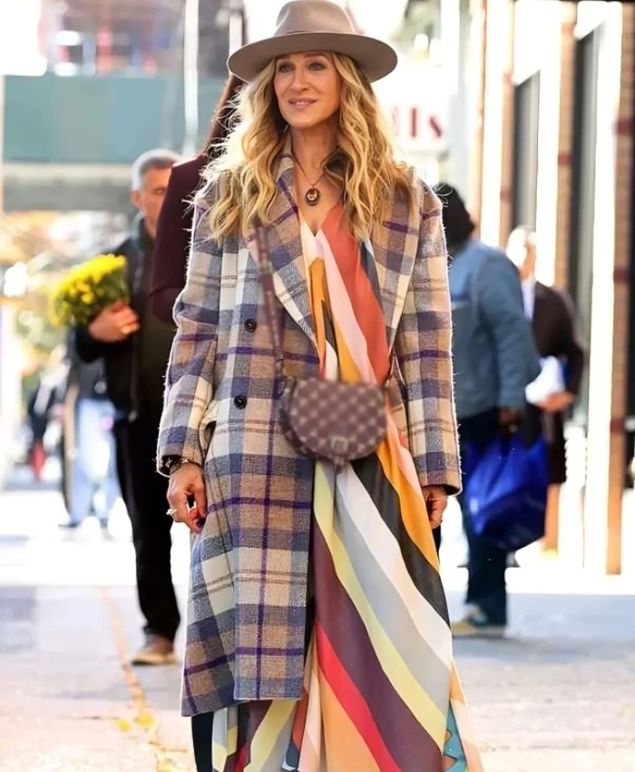 To start with, it is lined with soft viscose and made of a high-quality wool blend. So it keeps you warm without restricting your movement. This structured piece is perfect for running errands, meetings. Or just hanging out with friends, also thanks to its long sleeves, double-breasted button fastening. Also, a lapel-style collar and rounded cuffs. Further, it is also crafted with care and features a plaid coat. This Sarah Jessica Parker And Just Like That Season 2 Plaid Coat is part of And Just Like That Outfits Collection. It is also stylish and functional.