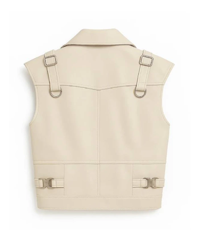 Style is not only about being loud, but it’s about expressing your confidence without having to say much. Also, this sleeveless leather vest represents that quiet confidence. It also combines modern flair with sophistication. It is constructed of top-quality PU leather, and features a smooth finish that brings attention without being over the top. The inner viscose lining ensures comfort through every wear. While the off-white shade with grey-beige undertones adds a refined and modern twist. Its zippered front closure brings structure and sleekness. Creating a balance between edge and elegance.