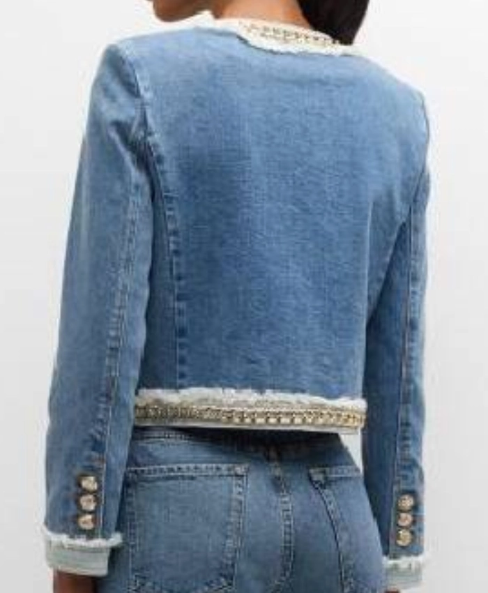 This Owning Manhattan S2 Chloe Tucker Caine Embellished Blue Denim Jacket at the Leather Jacket Black can be worn to a variety of settings and events. Because of its distinctive design, which ensures you stay stylish without compromising comfort, it is a reliable travel companion. This embellished denim jacket adds style and functionality to your travels, whether it is worn with jeans, skirts, or layered over clothing. It illustrates how stylish, practical, and widely wearable travel-ready clothing can be.