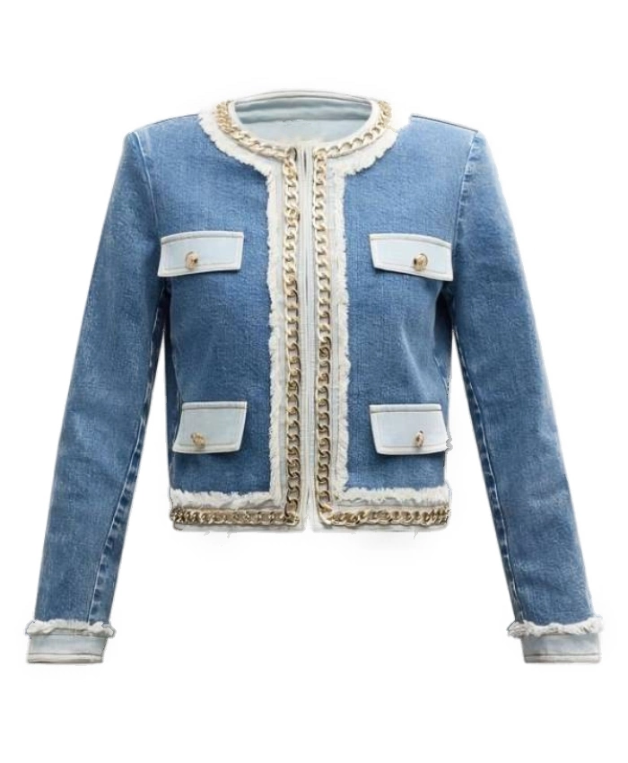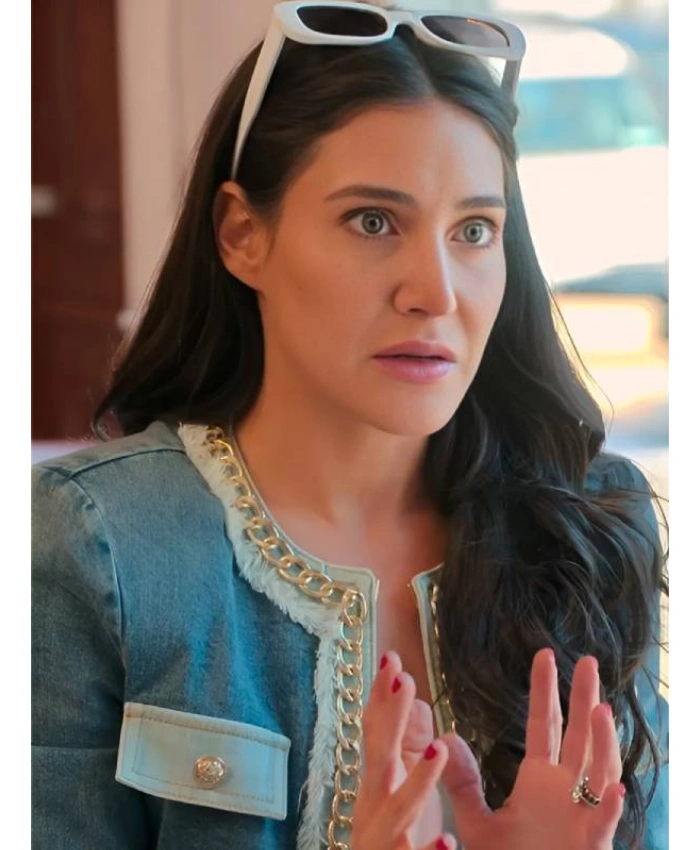 When you travel, you need clothes that are comfortable, stylish, and flexible. It’s natural to wonder if a statement jacket can do all of these things. The Chloe Caine Owning Manhattan S2 Embellished Denim Jacket from the TV Series Jackets Collection clears up this confusion. This blue denim jacket is inspired by Chloe Caine in the TV show “Owning Manhattan S2.” It has a chain-embellished design that makes your travel wardrobe look better while still being useful. Made of tough denim with a soft viscose lining, it’s comfortable for long trips and exploring the city.