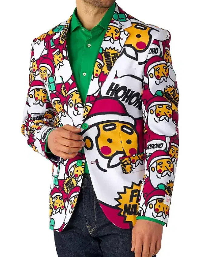 Celebrate the season in style with this printed blazer. Its vibrant holiday design makes it stand out, while the tailored fit keeps it sharp and polished. Ideal for anyone who loves mixing fun with fashion.