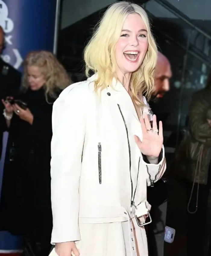 At Leather Jacket Black, we celebrate fashion moments that leave a mark. And this jacket captures one beautifully. The viscose lining on the inside brings comfort and breathability. At the same time, the UK Premiere Elle Fanning Predator: Badlands 2025 Embellished Belted White Biker Leather Jacket. It also stands as a perfect fusion of Hollywood allure and contemporary craftsmanship. Well, designed for those who appreciate a blend of attitude and elegance. It reflects the spirit of timeless stardom and effortless sophistication. Also, every inch of this piece showcases refined artistry and undeniable poise.