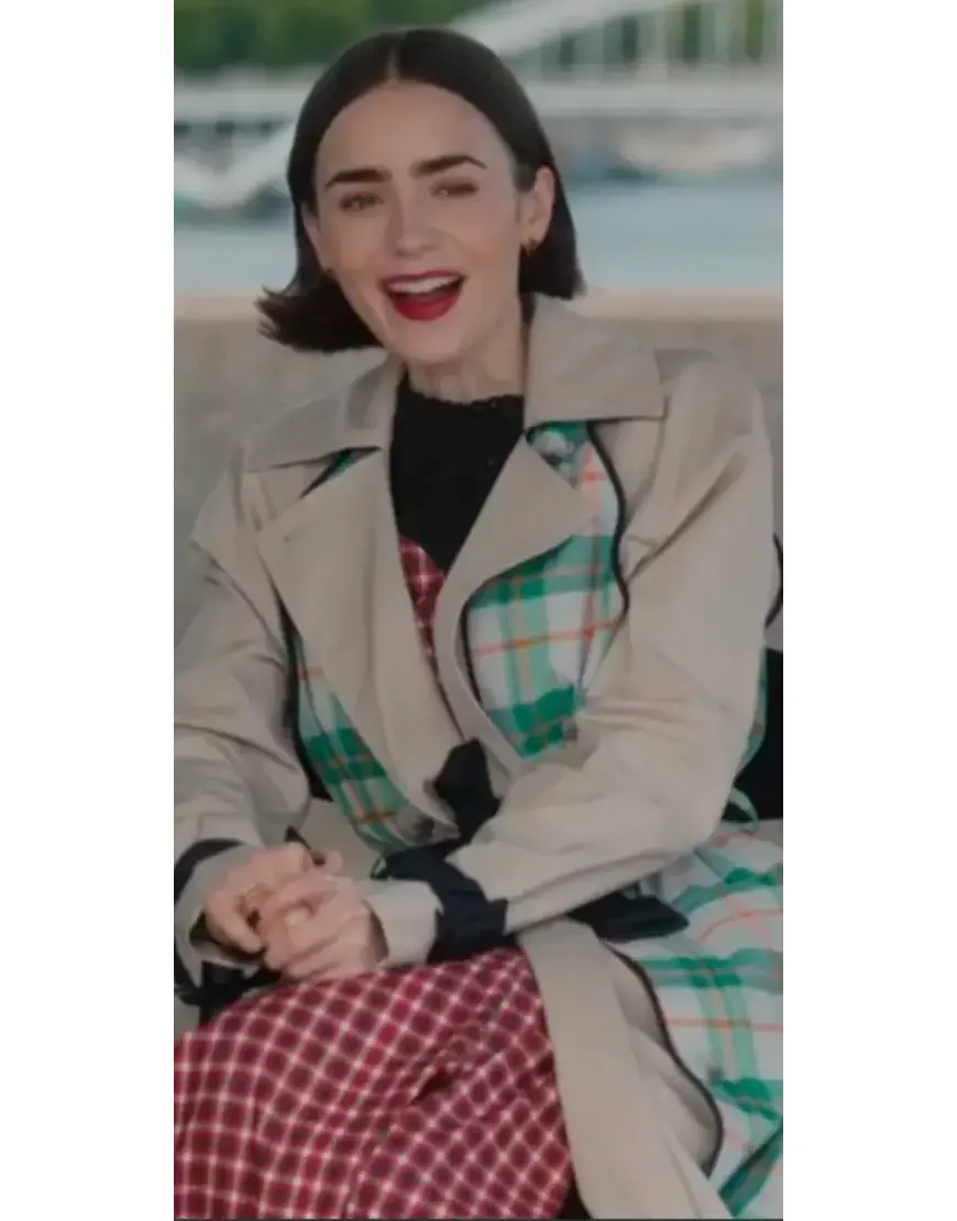 The Lily Collins Emily In Paris S05 Emily Cooper Plaid Trench Coat from our Emily In Paris Outfits For Sale is made of breathable cotton and has a smooth and soft viscose lining for comfort. The neckline looks sharper with a lapel-style collar. And the waist looks more defined with a buttoned front and belt closure. Adding movement with full-length sleeves and open hem belt cuffs. Likewise, the two pockets on the outside and two on the inside keep the function low-key but useful.