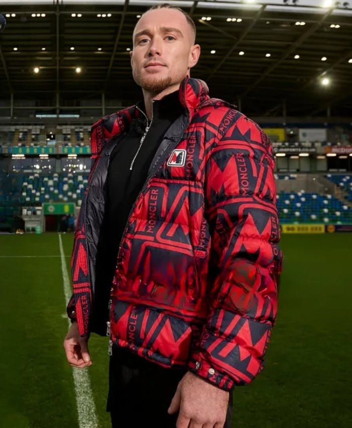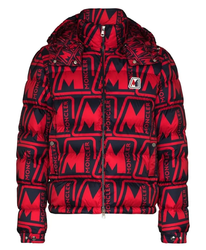 This puffer jacket combines a bold red and black color scheme with excellent winter warmth.