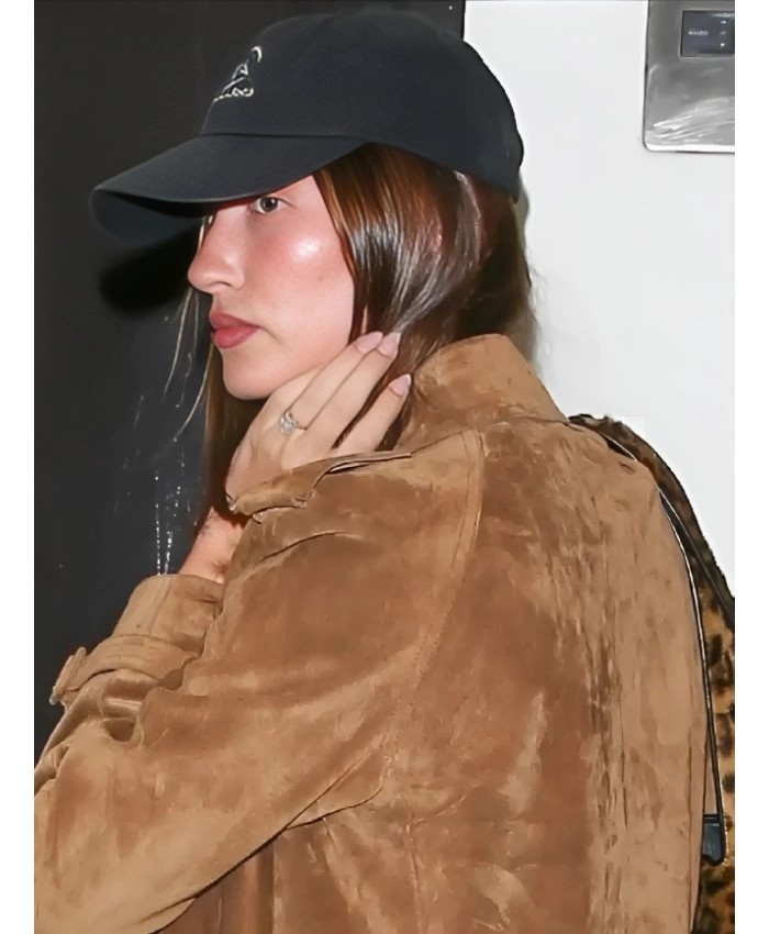 The long-line shape and strong construction of the Hailey Bieber Sushi Park 2025 Double-Breasted Brown Suede Trench Coat inspired this design. The coat stays in place without losing its style thanks to the rounded cuffs with adjustable straps and strong stitching. The coat has two outside pockets and one inside pocket so that it can hold all of your important things without any trouble. It’s more than just a fashion statement. Because of these smart choices, it fits in with the style of the Hailey Bieber Outfits Collection, which mixes practicality with high-end appeal.