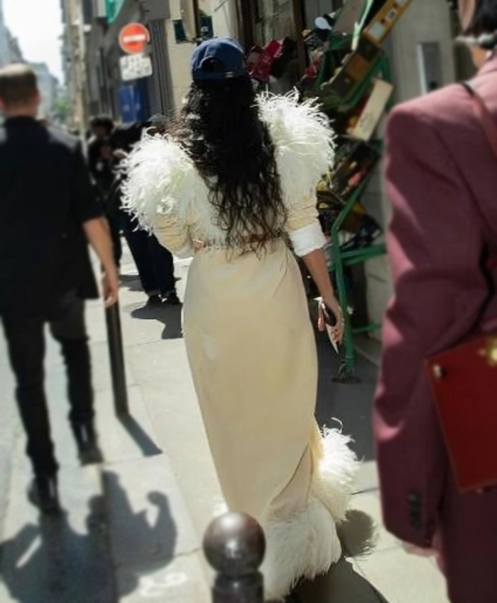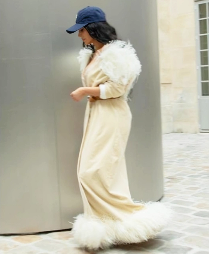 Additionally, the coat has a fur-like look, but the fabric underneath is strong enough. To keep the lining from flattening out when you move. The viscose lining on the inside keeps the fabric smooth on the inside, so the outside texture stays the same without any pressure points. The open front with a belt closure lets you control how it fits. This stops it from pulling too much, which can cause matting. Also, the coat has long sleeves, rounded cuffs, and a wide V-shaped fur collar. That gives it a balanced shape that is both dramatic and easy to wear. The full, long length and elegant cream color give it a Kim-like touch of class.