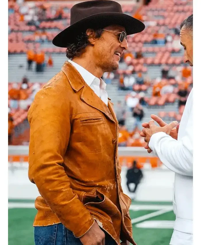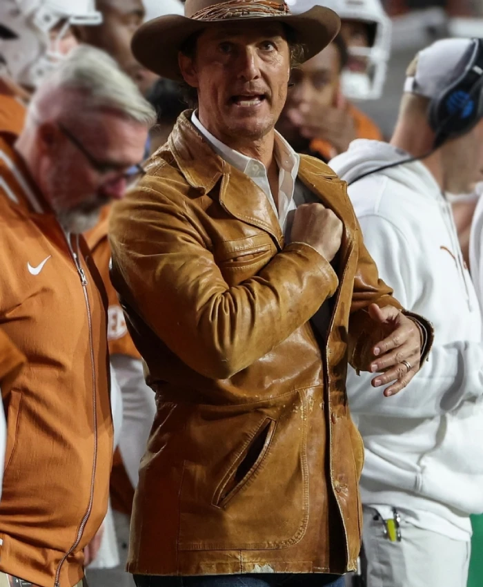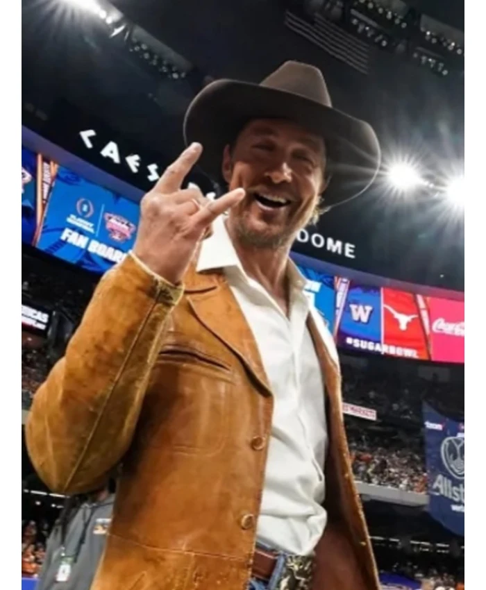 Recently, Matthew McConaughey was a big presence at the Allstate Sugar Bowl. The famous actor was spotted cheering on the sidelines as the Texas Longhorns took on the Washington Huskies in New Orleans. He wore an excellent brown leather jacket that looked so rugged yet stylish giving off cowboy vibes. This amazing jacket of him has now been included in our section of Men Leather Jacket as A New Arrival so You Can Read the Features Below: