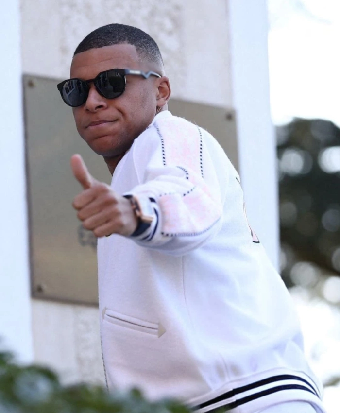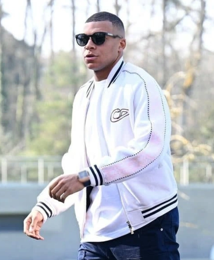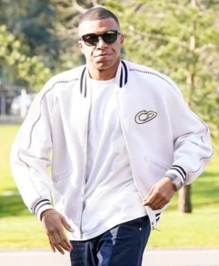 The Real Madrid Superstar Kylian Mbappe Christian White Dior Varsity Bomber Jacket reflects the spirit of ambition and modern style. The long sleeves and ribbed cuffs make it fit like a glove, and the ribbed hemline finishes off the elegant shape. The two outside pockets and one inside pocket are both useful and stylish. They give you room for your essentials while keeping the look sleek. Its pure white color gives off a strong sense of confidence. A piece that says a lot without trying too hard.