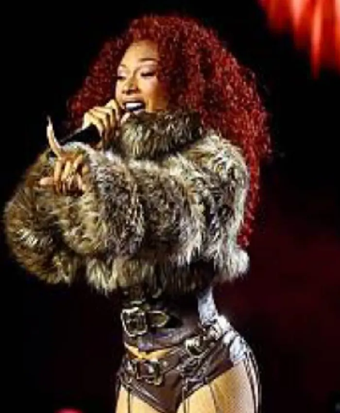 Shop Now Megan Thee 2025 Coachella Valley Music and Arts Festival Fur Cropped Jacket For Sale