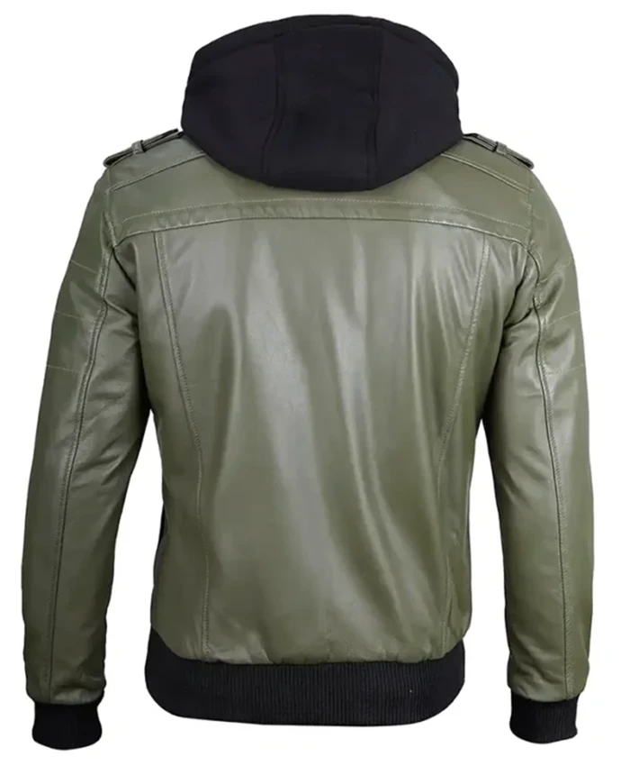Military Green Leather Jacket With Removable Hood