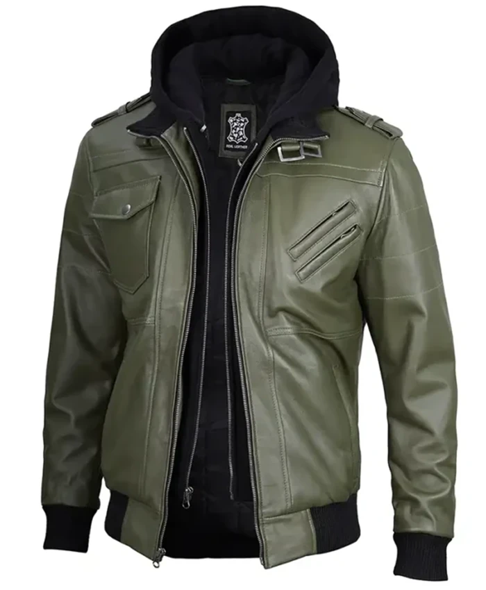 Be the first to review “Military Green Leather Jacket With Removable Hood”