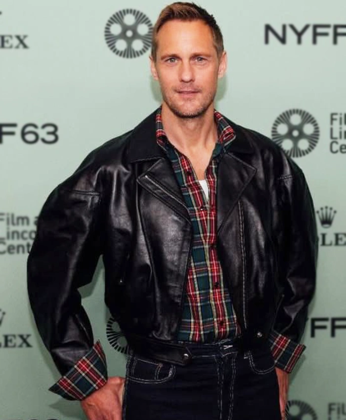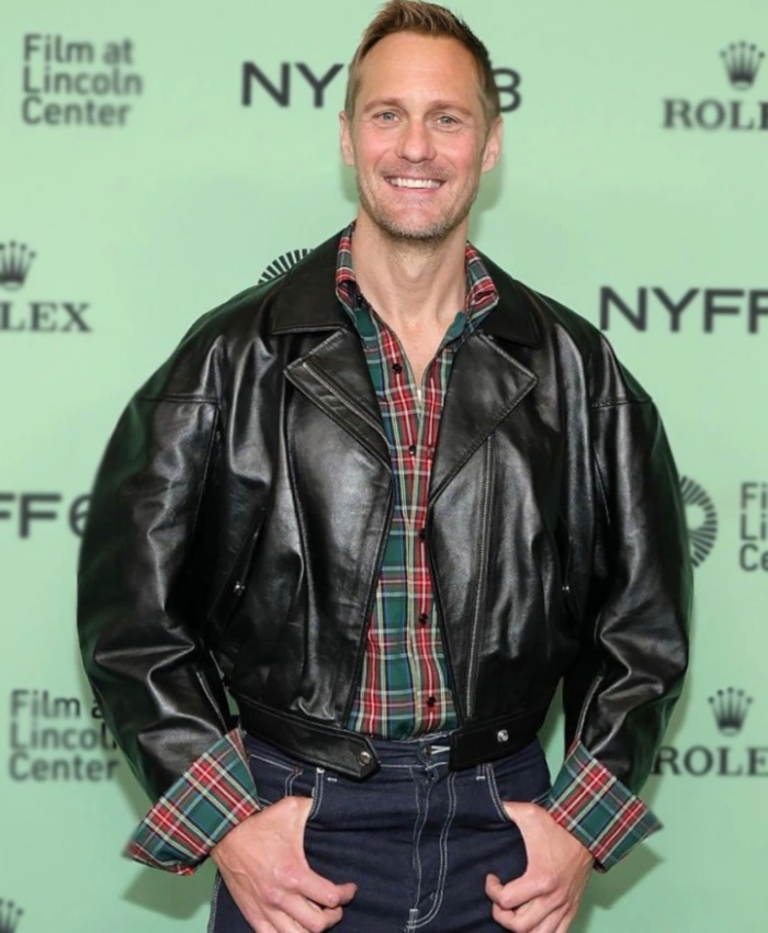 The soft viscose lining inside makes the jacket more comfortable and lets it sit easily on the body without being stiff. The zipper closure keeps the front looking neat, and the long sleeves with rounded button cuffs add a touch of class. The lapel-style collar frames the upper body nicely, giving it a tailored look that works in many situations. Amazingly, the Alexander Skarsgård Pillion Movie 2025 Red Carpet Ray Black Leather Jacket is also useful.