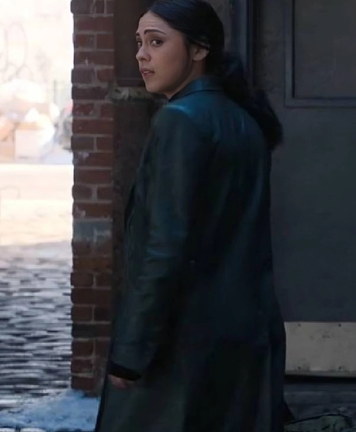Rosa Salazar Film Play Dirty 2025 Zen Leather Black Trench Coat
