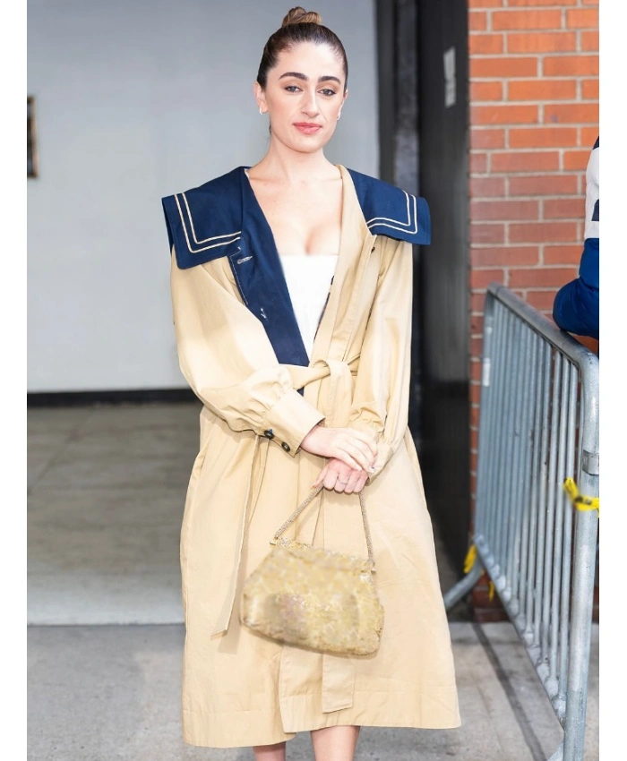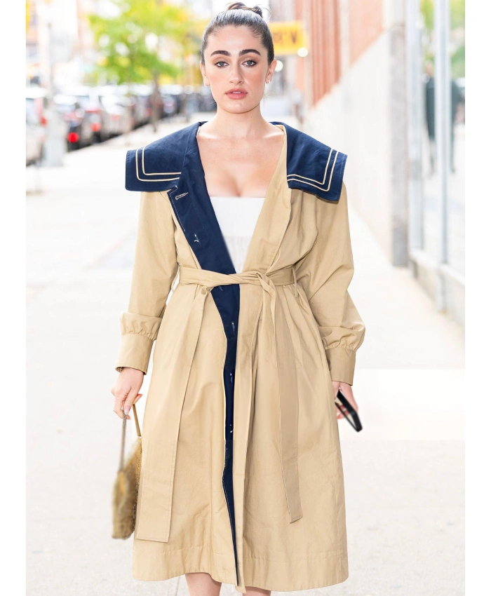 This trench coat is both stylish and useful. The rounded button cuffs on the long sleeves make it look polished and elegant, and the Peter Pan collar adds a magical touch of charm. The tan and navy color scheme makes it good for a lot of different events, from casual walks to business meetings. You can keep things in style with the coat’s two outside pockets and one inside pocket. This Rachel Sennott NYC Trench Coat was inspired by Rachel Sennott’s amazing performance in New York City 2025. It shows confidence, poise, and a modern look that is easy to wear.
