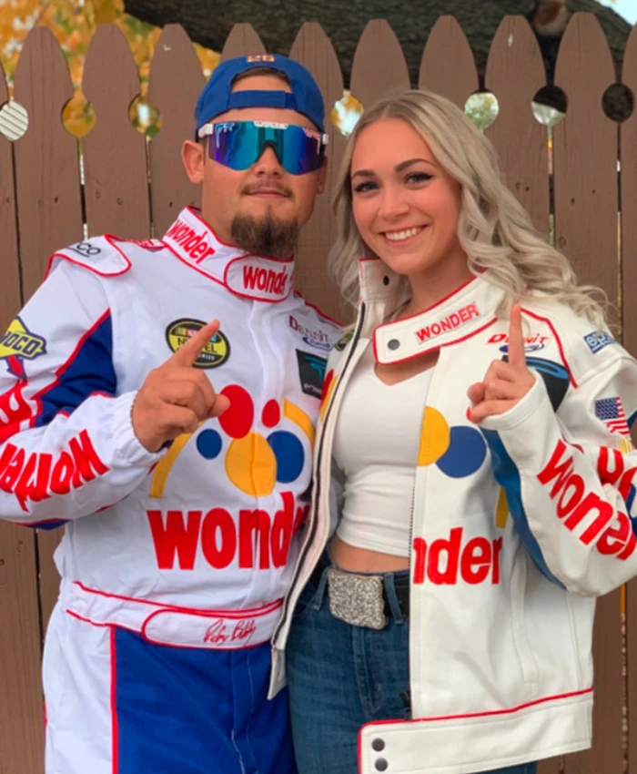 Moreover, the jacket is skillfully crafted from high-quality PU leather, offering both durability and a premium feel. Its inner soft viscose lining keeps you comfortable while you channel your inner speed racer. The Talladega Nights Couple Ricky Bobby and Wife Costume comes with a sleek zipper-style front closure and a snap tab collar, adding that authentic racing aesthetic. Designed in a pure white tone with detailed racing-inspired accents.
