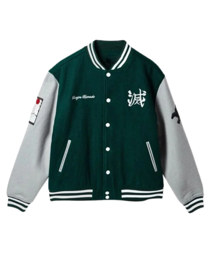 The Demon Slayer Kimetsu no Yaiba x Team Liquid Tanjiro Wool Varsity Jacket is made of a high-quality wool blend. And has a soft viscose lining that moves with the body. Tanjiro’s strength and bright colors inspire it. The snap-tab button closure keeps the look classic. And the rib-knitted collar, cuffs, and hem make sure the fit stays in place. The bold green and gray color scheme, along with the intricate graphics printed. On the front, sleeves, and back, it pays homage to the anime’s iconic style.