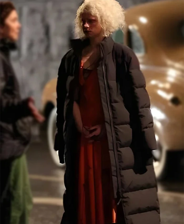 Jessie Buckley Film The Bride 2026 Black Puffer Long Coat