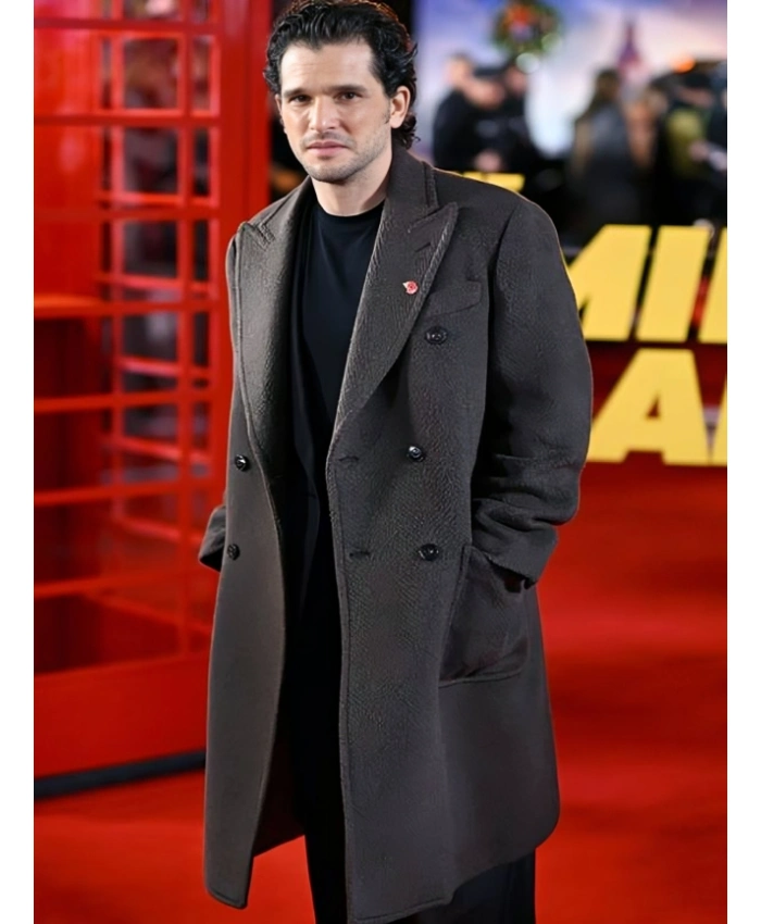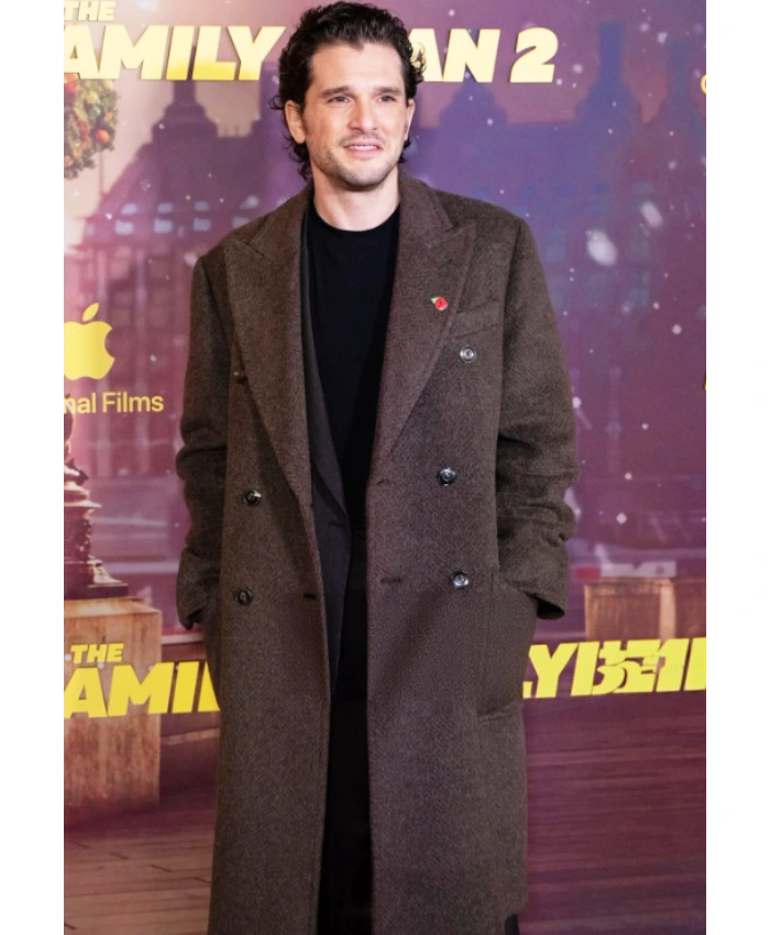 The design also looks like the original The Family Plan 2 Premiere 2025 Kit Harington Brown Coat, which has a double-breasted button closure that makes the front shape stronger. Amazingly, the notch lapel collar gives it a classic look, and the long sleeves and rounded cuffs make it look clean and polished. Wool-blend fabric naturally resists overstretching. So it keeps its classic drape instead of getting too loose with wear. This keeps the coat from sagging over time and keeps the fit steady.
