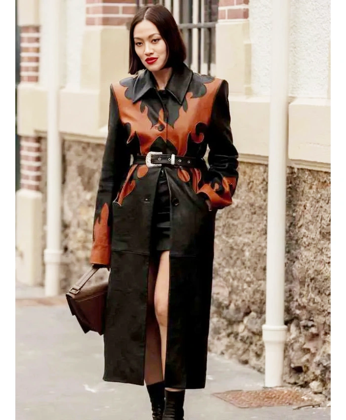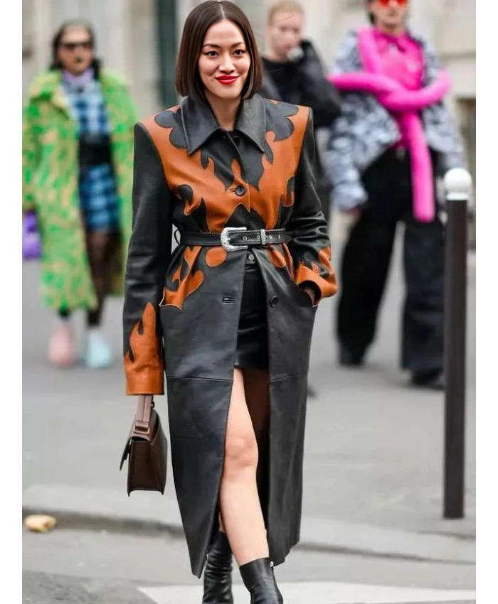 People often hesitate to buy unique outerwear because they are afraid it will look out of style sooner than they thought. Fashion changes quickly, and no one wants a coat that looks old after one season. More interestingly, the Tiffany Hsu Flames Print Coat is a confident answer to that problem. It is designed to look good while still making a strong statement. Well, you can only get this piece at Leather Jacket Black. It combines modern art with a classic structure. The Paris Fashion Week Cognac Flame Style Tiffany Leather Trench Coat is inspired by Tiffany Hsu’s look at the event.