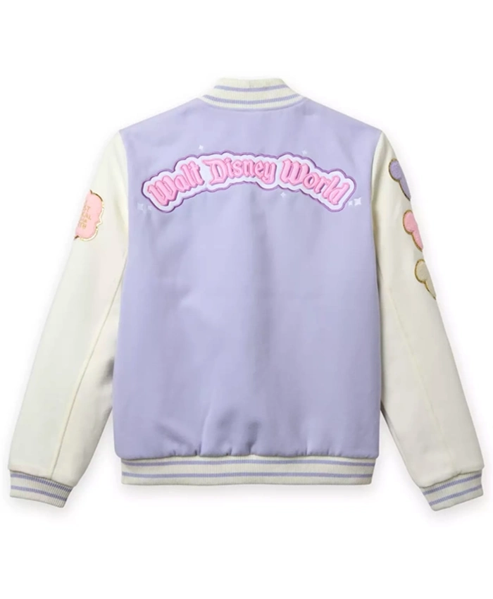 Nothing captures the spirit of Walt Disney World quite like a classic varsity jacket with a playful, retro twist. It’s the perfect wear for Disney die-hards wishing to showcase some attitude with the pastel shade of lavender letterman jacket that blends nostalgic charm with modernism. Whether on Main Street, USA or just waking up and throwing it over your favorite T-shirt, this jacket is a piece for the ages. The warmth provided by high-quality wool is enough to stave off the cold without being too heavy for comfort, whereas the soft viscose lining is the perfect second layer to keep you comfy in all weather. Rib-knitted cuffs, hemline, and collar provide a snug fit, all the while looking your best